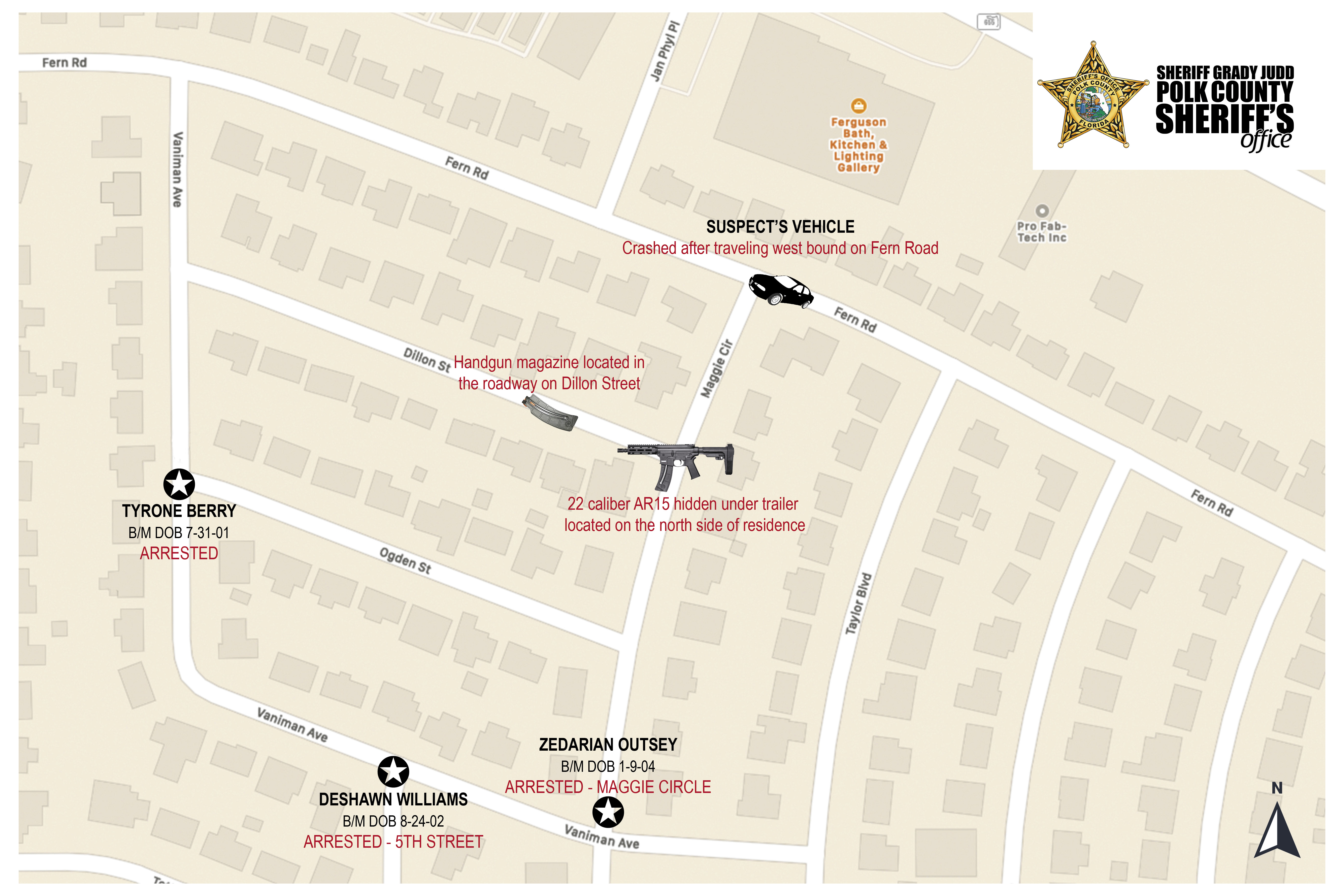 On Wednesday, May 26, 2021, PCSO detectives arrested 19-year-old Tyrone Berry of Haines City, 17-year-old Zedarian Outsey of Haines City, and 18-year-old Deshawn Williams of Winter Haven for attempted murder and other charges stemming from a drive-by shooting that occurred near Fern Road and Maggie Circle in unincorporated Winter Haven the same day.  Click here to watch the news conference.