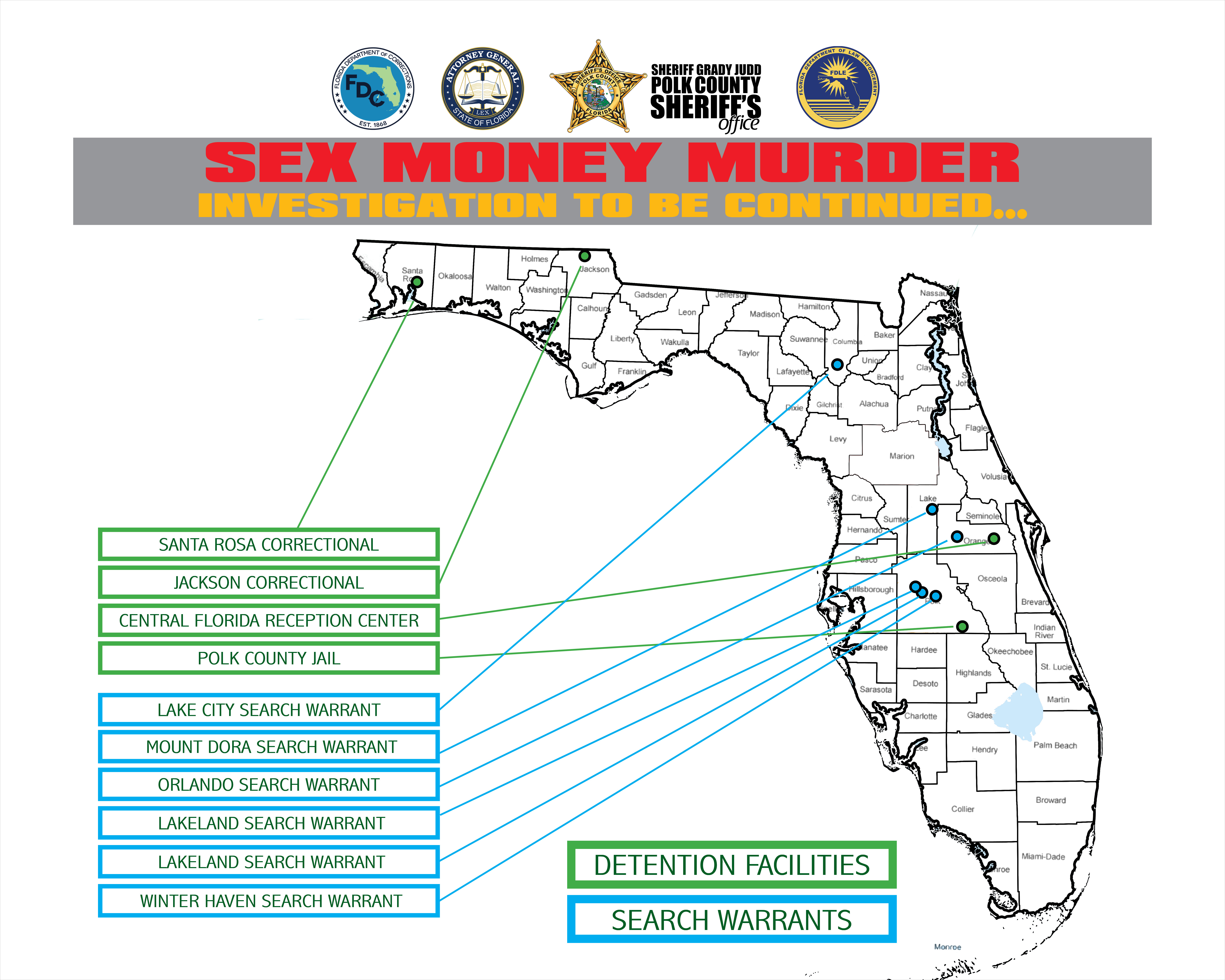 Detectives served six search warrants throughout the investigation in Lakeland (2), Winter Haven, Mount Dora, Orlando, and Lake City.